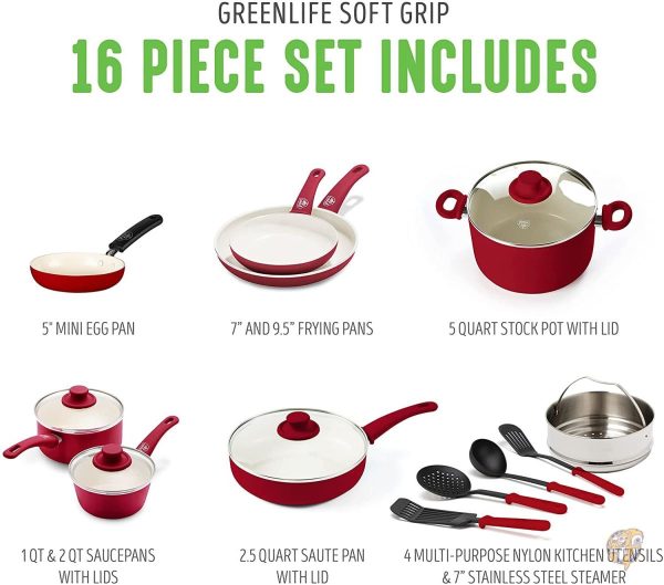 Greenlife 14-Piece Nonstick Ceramic Cookware Set with Soft Grips 16-Piece Red