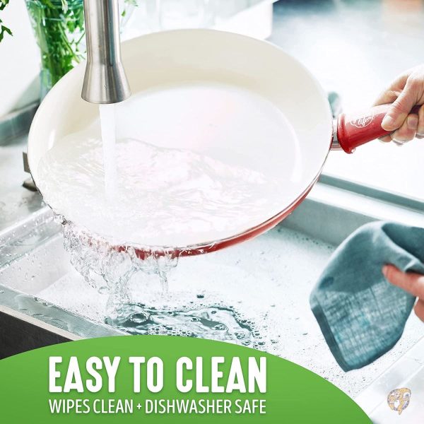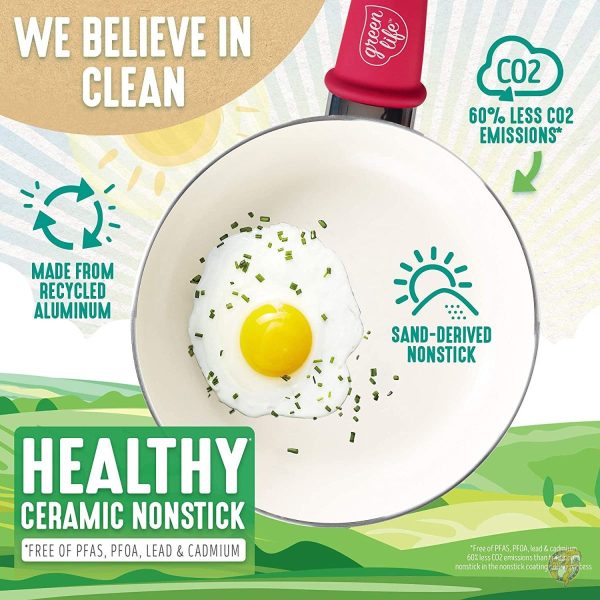 • Our healthy and easy to clean ceramic nonstick coating is made from sand and is free of PFAS, PFOA, lead and cadmium for easy cooking and quick cleaning