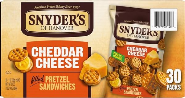 - Multi-pack box: 30 single-serve snack bags of pretzel sandwiches by Snyder’s of hanvoer
