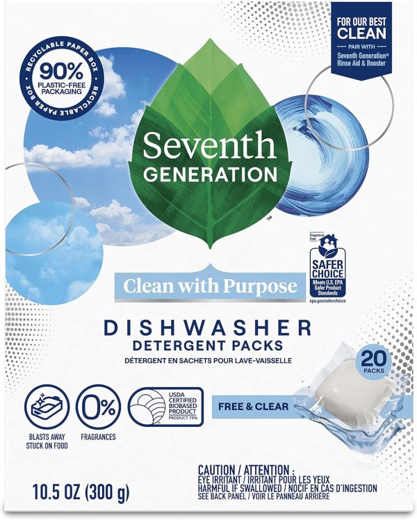 • Seventh Generation Free & Clear Dishwasher Detergent Packs have an enzyme-rich formula that cuts through tough grease and food residue to leave dishes sparkling clean