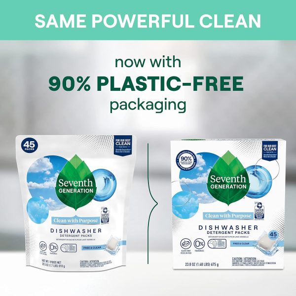 Seventh Generation Dishwasher Detergent Packs for Sparkling Dishes Free & Clear Dishwasher Tabs 45 Count, Pack of 2 (Packaging May Vary)